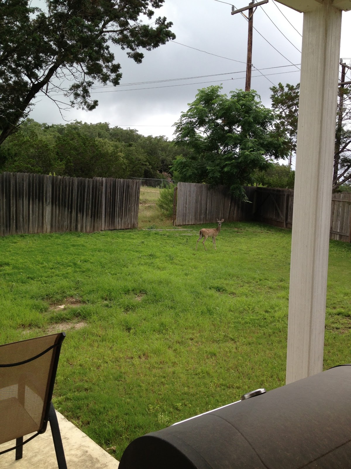 That’s how our larger visitors are gaining entry. Tristan and I are lobbying to leave the section down because we love all our daytime visitors. Before the fence fell, we could only see them from the 2nd floor windows. They would be grazing behind the fence in the green belt. Now they come right up to the windows and doors. Matt is out of town again this week, so I like to think these cute critters are stopping by to keep me company. Me and my pajamas (that’s the dress code at my new office).