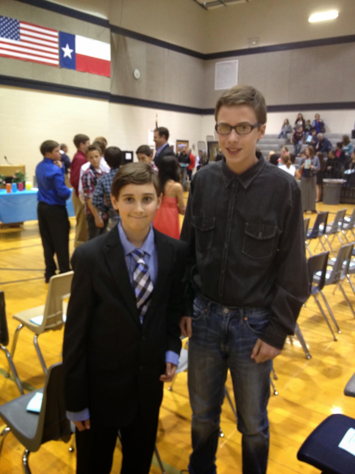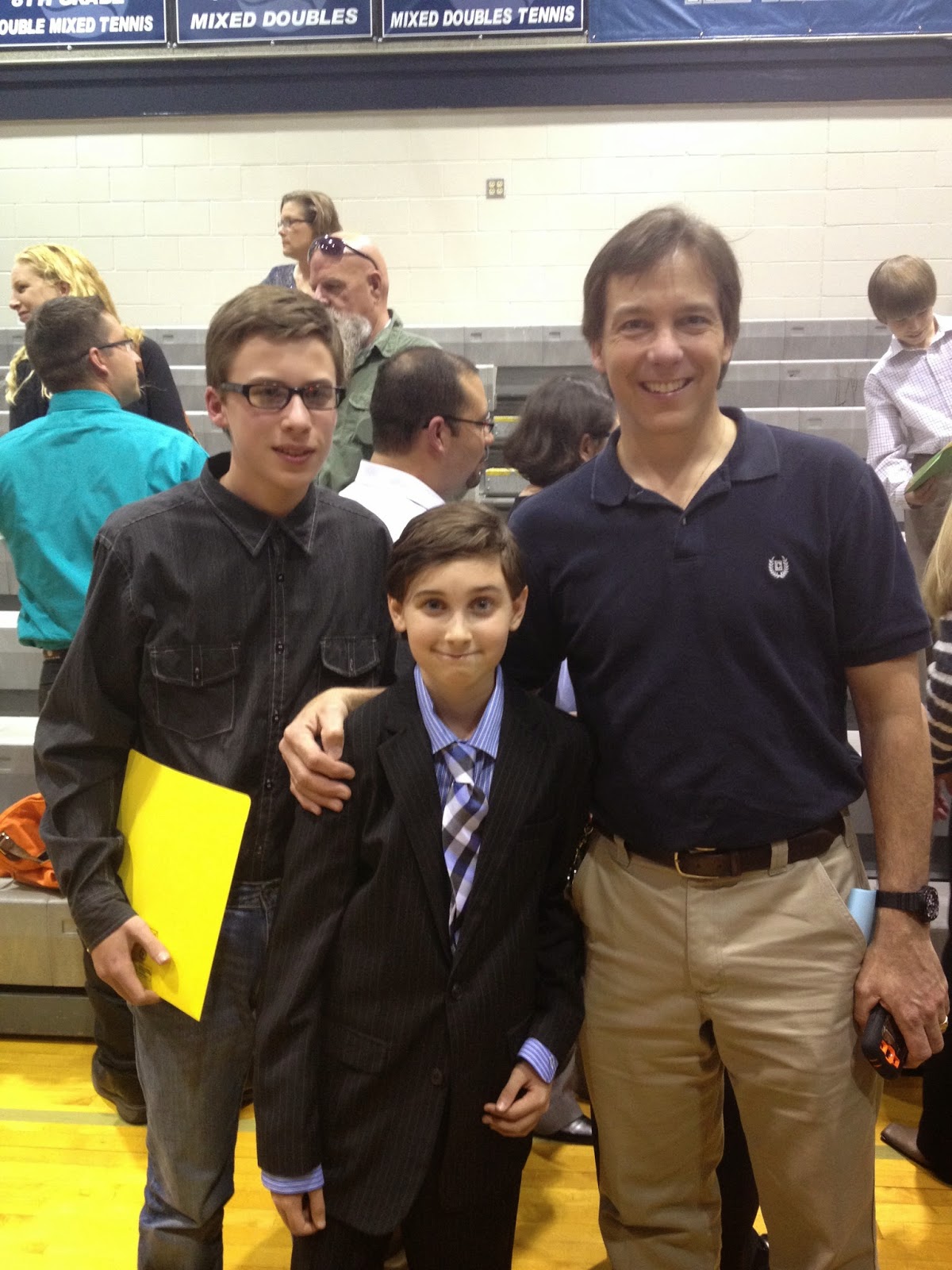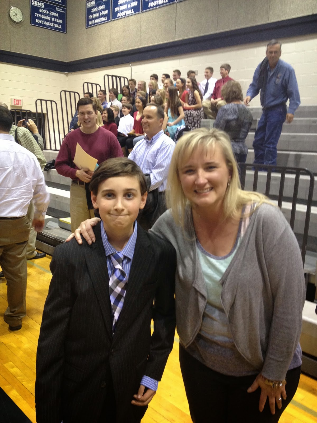 The ceremony was very emotional as the teachers and counselors spoke of the kids. Tristan’s gifted and talented teacher was given special mention at the ceremony and I teared up to hear a very special teacher receive the praise he deserved. Each child was able to honor a teacher as a mentor, and Mr. Mann is the teacher Tristan chose (Mr. Cuda is no longer teaching, but was actually promoted to Vice Principal of an elementary school). We were surprised and thrilled to see Mr. Cuda across the gym. Each kiddo was called up, their mentor was mentioned, and they were given certificates and their official membership cards (start the video below at 0:30 to see Tristan’s walk).